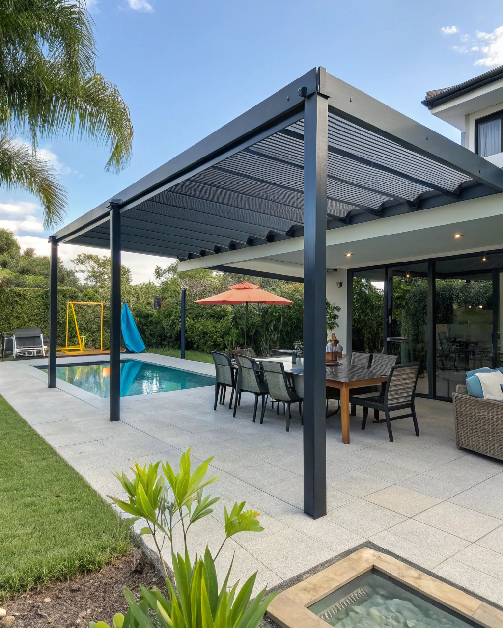 Pergolas provide architectural shade with solid roofing or louvred systems that adjust throughout the day. We build custom pergolas with powder-coated aluminium frames that won’t corrode in salt air, incorporating fixed or operable llouvresthat control sun exposure and rainfall protection. Timber pergolas using treated hardwood offer traditional aesthetics with cyclone-rated engineering for structural integrity.