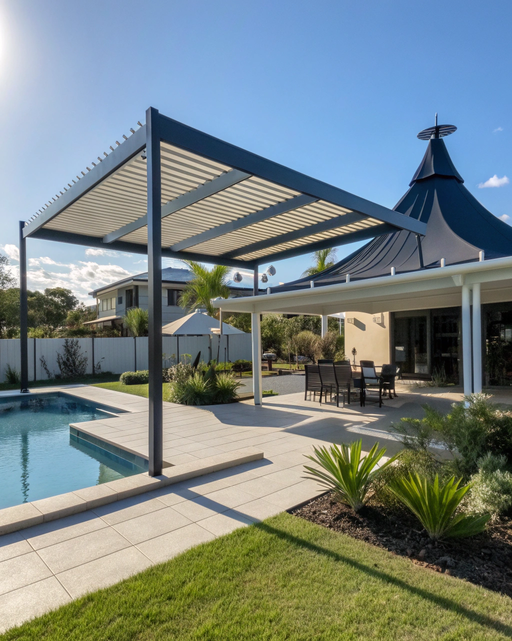 Our designs incorporate drainage systems handling 150mm+ rainfall events common during Queensland’s wet season. Pitched roofing, integrated gutters, and proper runoff management prevent water pooling and structural stress. We provide guidance on securing retractable elements before severe weather and engineering ensures structures survive cyclonic conditions.